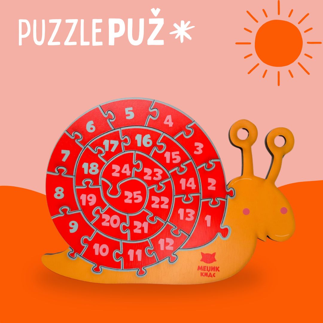 Ovaj simpatični puž donosi zabavu i učenje u svaki dom, dok mališani slažu delove i istražuju oblike, boje i teksture. 🌿
